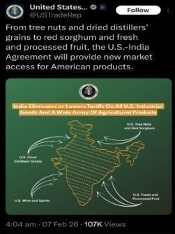 USTR ने शुक्रवार को सोशल मीडिया पर अंतरिम व्यापार समझौते के फायदों को हाइलाइट करते हुए एक पोस्ट किया। इसमें लिखा था कि ‘ट्री नट्स, ड्राइड डिस्टिलर्स ग्रेन, रेड सोरघम और ताजे व प्रोसेस्ड फलों’ जैसे अमेरिकी उत्पादों के लिए भारत में नए बाजार खुलेंगे। हालांकि, पोस्ट के साथ साझा किए गए ग्राफिक में भारत का राजनीतिक नक्शा इस्तेमाल किया गया, जिसमें जम्मू-कश्मीर, लद्दाख का अक्साई चिन और अरुणाचल प्रदेश को पूर्ण रूप से भारत का हिस्सा दिखाया गया है। नक्शे में कोई अलग सीमांकन, डॉटेड लाइन या विवादित क्षेत्र का उल्लेख नहीं है।