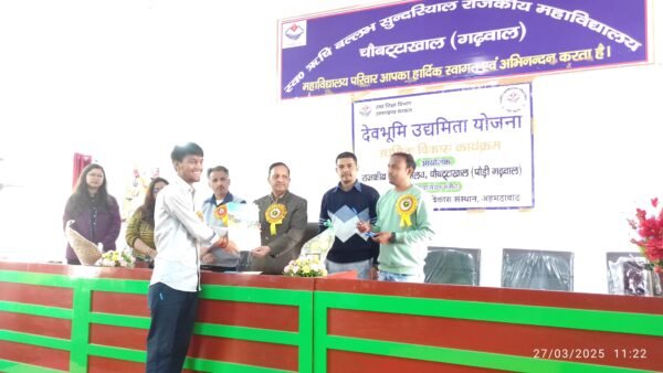 पौड़ी : राजकीय महाविद्यालय चौबट्टाखाल में दवभूमि उद्यमिता योजना उच्च शिक्षा विभाग उत्तराखण्ड सरकार द्वारा 12 दिवसीय उद्यमिता विकास कार्यक्रम का शुभारम्भ महाविद्यालय के सभागार में किया गया जिसमें प्रथम दिन आज 27 मार्च 2025 को कार्यक्रम का शुभारंभ महाविद्यालय के प्राचार्य प्रो. मुरलीधर कुशवाहा, देवभूमि उद्यमिता केंद्र के नोडल अधिकारी डॉ. श्रवण कुमार तथा कार्यक्रम समन्वयक राहुल कुमार एवं भारतीय उद्यमिता विकास संस्थान अहमदाबाद से आये परियोजना अधिकारी सरबेन्द्र रावत द्वारा संयुक्त रूप से मां सरस्वती के चित्र के सम्मुख दीप प्रज्वलन किया गया।