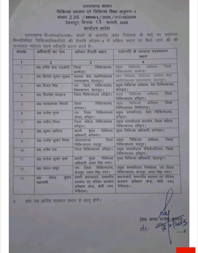 2. डॉ. बिंदेश कुमार शुक्ला – स्वास्थ्य सेवा महानिदेशालय, देहरादून से अपर निदेशक, नियोजन, स्वास्थ्य सेवा महानिदेशालय, देहरादून नियुक्त।