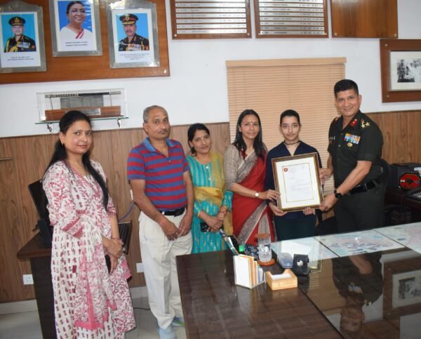 लैंसडाउन । आर्मी पब्लिक स्कूल लैंसडौन की कक्षा 12वीं की कला संकाय की छात्रा नन्दनी गुप्ता को बोर्ड परीक्षा 2023- 24 में 98.8 प्रतिशत अंक प्राप्त करने व प्रदेश में तीसरा तथा जनपद में प्रथम स्थान प्राप्त करने पर लेफ्टिनेंट जनरल मुकेश चड्ढा, एसएम, वीएसएम, चीफ ऑफ स्टाफ, मध्य कमान के द्वारा लिखित प्रशंसा पत्र को स्कूल के चेयरमैन ब्रिगेडियर विनोद सिंह नेगी वीएसएम द्वारा प्रदान किया गया। इसके अतिरिक्त एडब्ल्यूईएस,मध्य कमान द्वारा दस हजार रूपए की धनराशि एव पांच हजार रूपए की ज्ञानवर्धक पुस्तकें छात्रा को प्रोत्साहित करने हेतु प्रदान की गई। बोर्ड परीक्षा में उत्कृष्ठ प्रदर्शन करने पर स्कूल मैनेजमेंट के द्वारा भी नंदनी गुप्ता को पांच हजार रुपए की धनराशि दी गई।