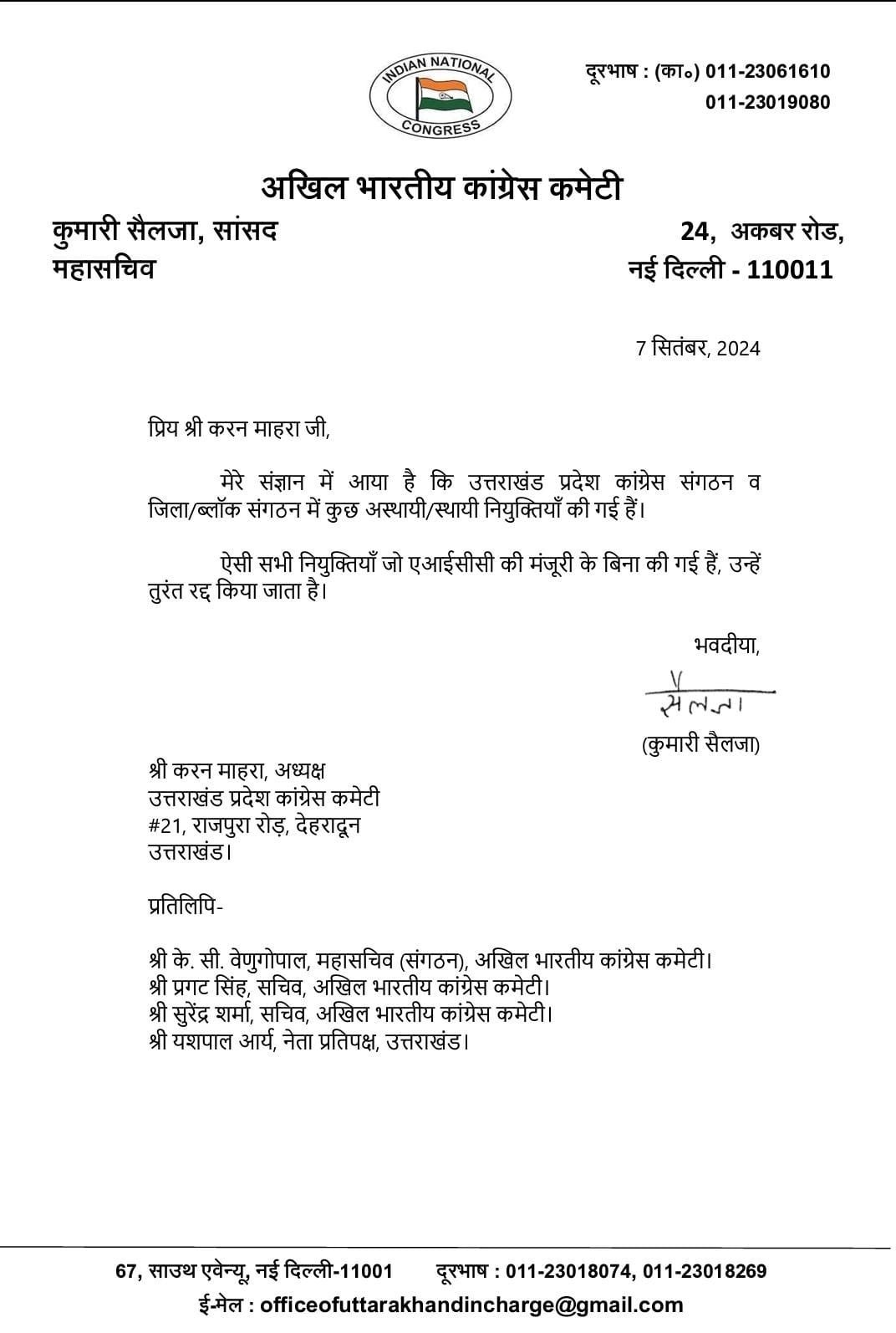 देहरादून: कांग्रेस लोकसभा चुनाव के बाद बदली-बदली नजर आ रही है। उसकी झलक कांग्रेस के फैसलों में भी नजर आ रही है। संगठन से जुड़े फैसलों पर भी सख्ती से एक्शन लिया जा रहा है। ऐसा ही एक चिट्टी कांग्रेस प्रभारी लोकसभा सांसद कुमारी शैलजा ने कांग्रेस प्रदेश अध्यक्ष करना माहरा को लिखी है।