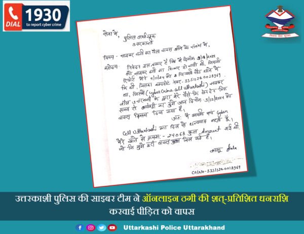 उत्तरकाशी : विगत 9 नवम्बर 2024 को चिन्यालीसौड़ निवासी एक युवती के द्वारा अपने साथ 24,068 रुपये की साइबर धोखाधड़ी होने के सम्बन्ध में ऑनलाइन शिकायत दर्ज की गयी थी। पुलिस अधीक्षक के दिशा-निर्देशन में उत्तरकाशी पुलिस की साइबर टीम द्वारा उक्त मामले में कार्यवाही करते हुये पीडित से ठगी की गयी शत्-प्रतिशत धनराशि आज वापस करवायी गयी है। युवती के द्वारा पैंसा वापस मिलने पर उत्तरकाशी पुलिस व साइबर टीम का पत्र लिखकर आभार प्रकट किया गया।