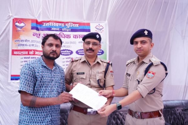 हरिद्वार : नए कानून के तहत पहली FIR दर्ज करने वाला नंबर 01 जिला बना हरिद्वार। एसएसपी हरिद्वार के नेतृत्व में दर्ज हुआ राज्य का पहला मुकदमा। वादी को डिजिटली साइन FIR की कॉपी देने वाला राज्य का पहला जिला बना हरिद्वार। कोतवाली ज्वालापुर में भारतीय न्याय संहिता (BNS) की धारा 309(4) के तहत दर्ज हुआ पहला मुकदमा। चाकू के बल पर मोबाइल लूट की घटना का है मामला। बिजनौर निवासी वादी विपुल भारद्वाज पुत्र जसपाल भारद्वाज निवासी मोहल्ला जाटान कोतवाली शहर बिजनौर बने नए कानून प्रणाली के पहले वादी। वादी विपुल भारद्वाज द्वारा कराया दो अज्ञात व्यक्तियों के विरुद्ध नए कानून के तहत अभियोग पंजीकृत ।