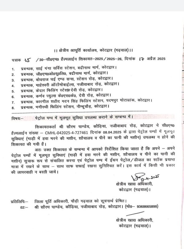 कोटद्वार । नगरनिगम कोटद्वार के अन्तर्गत आने वाले कई पेट्रोल पंप में मूलभूत सुविधाएं जैसे गाड़ी के टायरों में हवा भरने की मशीन, शौचालय और पीने का पानी आदि नहीं है जबकि जब इन पेट्रोल पंपों को लाइसेंस दिया जाता है तो उसमें यह अंकित किया जाता है कि जो भी ग्राहक की मूलभूत सुविधाएं हैं वह सब उपलब्ध करवाई जाएगी । कोटद्वार के अधिकांश पैट्रोल पंपो में यह सुविधाएं न होने पर छात्र नेता सौरभ पांडेय ने सीएम हेल्पलाइन पर शिकायत की है। जिसके बाद क्षेत्रीय खाद्य अधिकारी कोटद्वार द्वारा सभी पेट्रोल पंप संचालकों को सुचारू रूप से पेट्रोल पंप संचालित करने, पर्याप्त ईंधन स्टॉक रखने और साफ सफाई रखने के सख्त निर्देश जारी कर दिए गए है साथ ही इस कार्य में लापरवाही न बरतने को भी कहा है।
