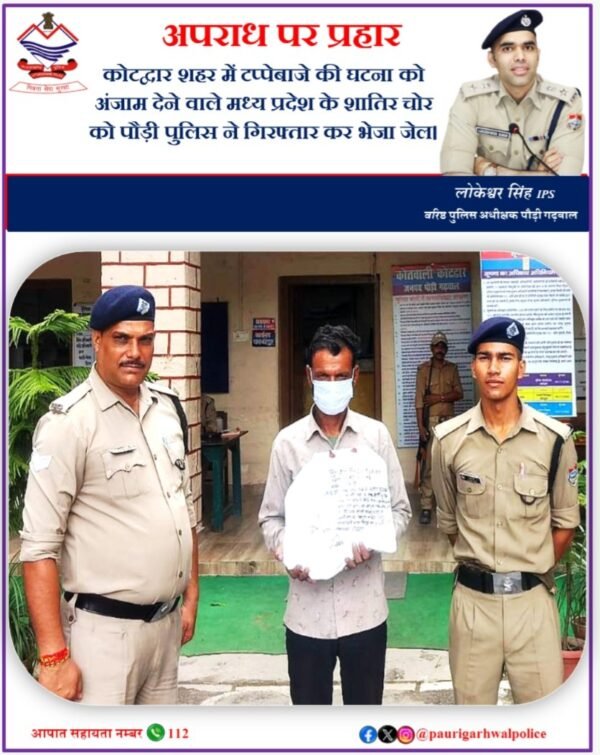 वरिष्ठ पुलिस अधीक्षक पौड़ी लोकेश्वर सिंह द्वारा उक्त चोरी की घटना को गम्भीरता से लेते हुये अभियुक्त की शीघ्र गिरफ्तारी कर घटना का अनावरण करने हेतु प्रभारी निरीक्षक कोटद्वार को टीम गठित करने हेतु निर्देशित किया गया। निर्गत निर्देशों के क्रम में गठित पुलिस टीम द्वारा कुशल सुरागरसी पतारसी कर व सीसीटीवी कैमरों की मदद से अथक प्रयासों के उपरान्त उक्त अभियोग में संलिप्त अभियुक्त जेके पुत्र पुत्र बदीन, निवासी- बकेन जैतपुर थाना आनंदपुर जिला विदिशा मध्य प्रदेश, उम्र 42 वर्ष को दिल्ली फार्म रोड़ कोटद्वार के पास से गिरफ्तार कर माननीय न्यायालय के समक्ष पेशकर जेल भेज दिया गया है।