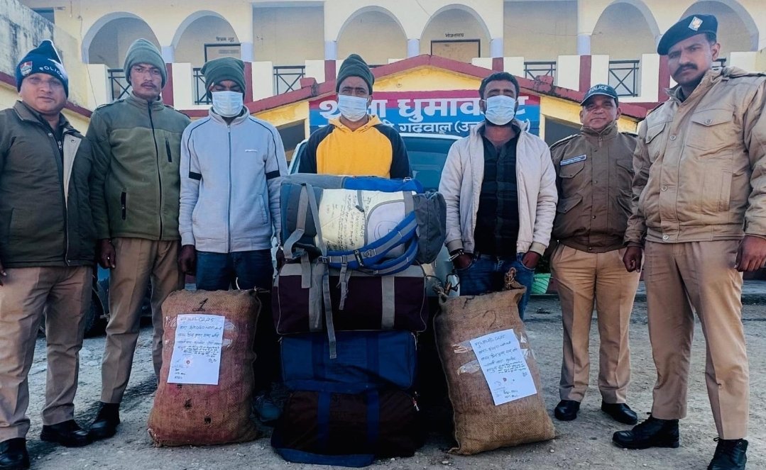 पौड़ी : जनपद के धुमाकोट में पुलिस द्वारा चैक पोस्ट शंकरपुर धुमाकोट में सघन चेकिंग की जा रही थी, जहा चेकिंग के दौरान एक स्कार्पियो (वाहन संख्या- UP84Z-3755) संदिग्ध प्रतीत होने पर रोकी गयी, जिसकी पुलिस टीम द्वारा तलाशी ली गयी, तो वाहन में 03 व्यक्ति क्रमशः प्रिंस कुमार डागर उर्फ गोलू, शहजाद व इरशान बैठे हुए थे और वाहन से 79.20 किलोग्राम अवैध गांजा बरामद किया गया, जिसे इनके द्वारा स्थानीय व्यक्ति से खरीदकर लाया जा रहा था। अभियुक्तों को गिरफ्तार कर थाना धुमाकोट में अभियुक्तों के विरूद्ध एनडीपीएस एक्ट के तहत अभियोग पंजीकृत किया गया। उक्त अभियुक्तगणों को न्यायालय के समक्ष पेश कर आवश्यक वैधानिक कार्यवाही की जा रही है।