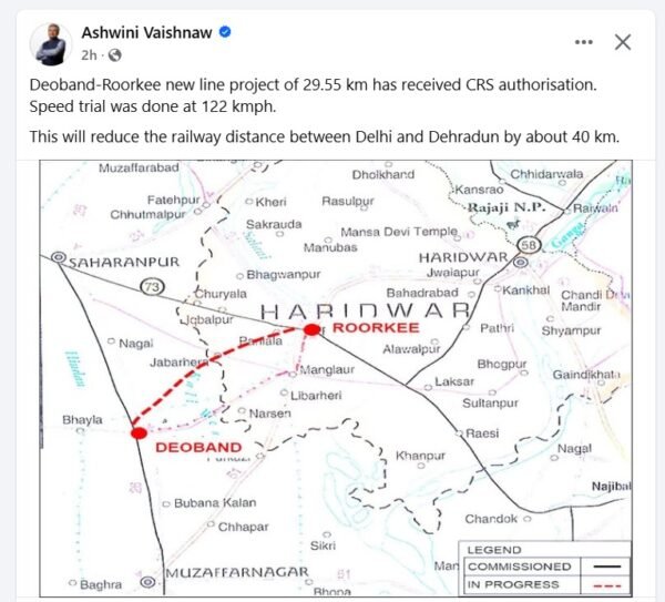 मुख्यमंत्री ने कहा, “प्रधानमंत्री नरेंद्र मोदी के नेतृत्व में देश के इंफ्रास्ट्रक्चर में अभूतपूर्व विकास हो रहा है। उत्तराखंड में रेलवे नेटवर्क को मजबूत करना हमारी प्राथमिकता रही है, और देवबंद-रुड़की रेल लाइन उसी दिशा में एक ऐतिहासिक कदम है। मैं रेल मंत्री अश्विनी वैष्णव जी का भी विशेष धन्यवाद करता हूं, जिनके मार्गदर्शन में यह परियोजना तेज़ी से आगे बढ़ रही है।”