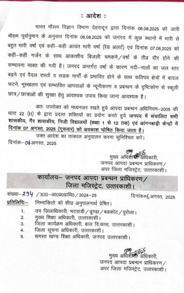 लगातार बारिश के कारण नदी-नालों के जलस्तर में वृद्धि और सड़क व पैदल मार्गों के बाधित होने की संभावना को देखते हुए जिला प्रशासन ने एहतियाती कदम उठाए हैं। आपदा प्रबंधन अधिनियम 2005 की धारा 22 (h) के तहत जिला आपदा प्रबंधन प्राधिकरण/अपर जिला मजिस्ट्रेट, उत्तरकाशी ने आदेश जारी कर जिले के सभी सरकारी, गैर सरकारी व निजी विद्यालय (कक्षा 1 से 12 तक) एवं आंगनबाड़ी केंद्रों में 7 अगस्त, शुक्रवार को अवकाश घोषित किया है।