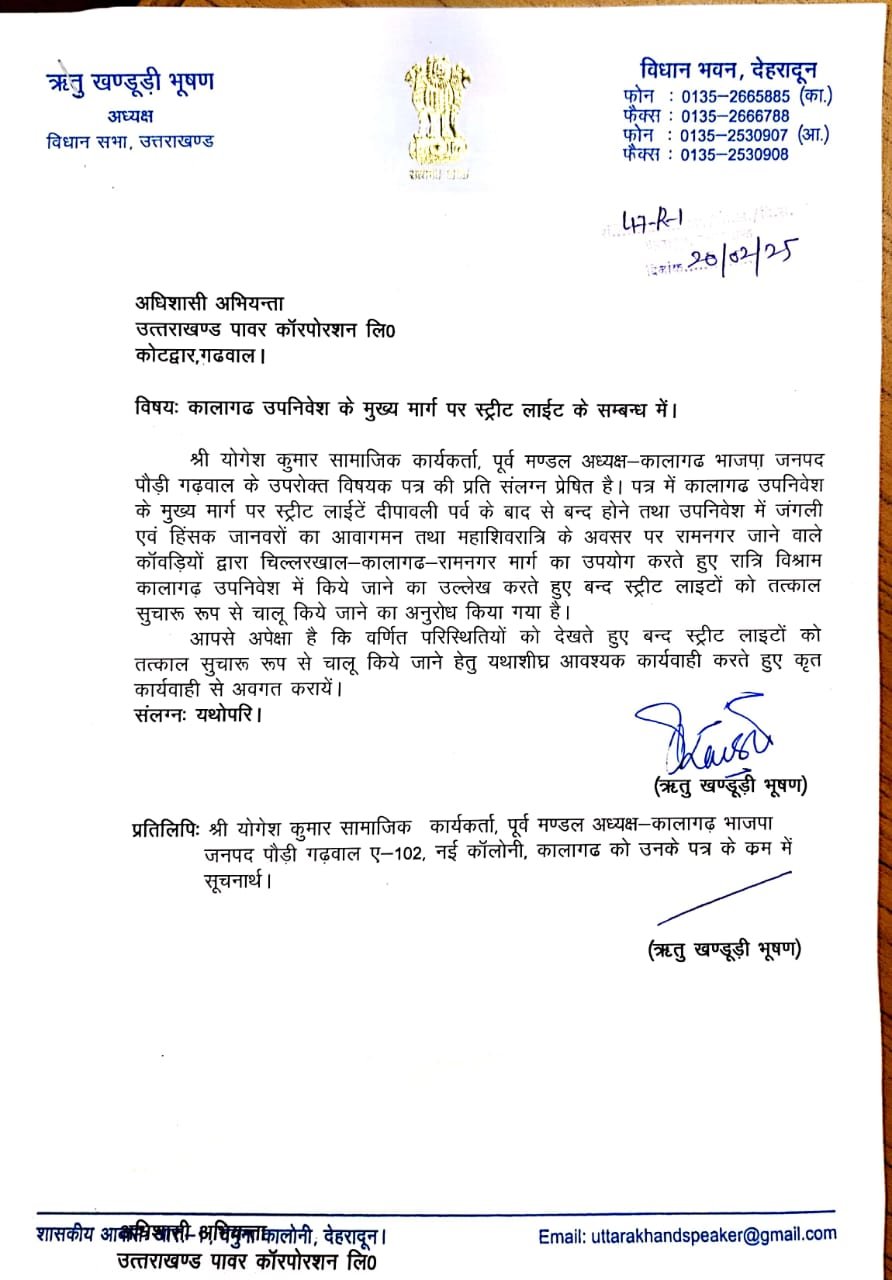 कालागढ़। उत्तराखंड विधानसभा अध्यक्ष ऋतु खंडूड़ी भूषण ने कालागढ़ उपनिवेश के मुख्य मार्ग पर बंद पड़ी स्ट्रीट लाइटों को लेकर उत्तराखंड पावर कॉरपोरेशन लिमिटेड के अधिशासी अभियंता को पत्र लिखकर तत्काल कार्रवाई के निर्देश दिए हैं। भाजपा नेता एवं समाजसेवी योगेश कुमार ने विधानसभा अध्यक्ष को पत्र लिखकर इस समस्या की ओर ध्यान आकर्षित किया था। पत्र में बताया गया कि दीपावली के बाद से ही इस क्षेत्र की स्ट्रीट लाइटें बंद पड़ी हैं, जिससे स्थानीय लोगों को भारी परेशानी हो रही है। खासकर, यह इलाका जंगली और हिंसक जानवरों की आवाजाही वाला क्षेत्र है, जिससे अंधेरे में लोगों को खतरा बना रहता है।