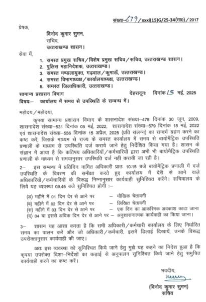 देहरादून: उत्तराखंड सरकार ने एक बार फिर सरकारी कार्यालयों में समयबद्धता और अनुशासन को लेकर बड़ा कदम उठाया है। सचिव विनोद कुमार सुमन द्वारा दिनांक 15 मई 2025 को जारी आदेश में स्पष्ट किया गया है कि अब सभी अधिकारी-कर्मचारियों को प्रातः 10:15 बजे तक बायोमेट्रिक प्रणाली के माध्यम से उपस्थिति दर्ज करानी अनिवार्य होगी। यह निर्णय पूर्व में जारी शासनादेशों के अनुपालन में लिया गया है, जिसमें समय से कार्यालय में उपस्थिति सुनिश्चित कराने के निर्देश दिए गए थे। अब इसे लेकर मॉनिटरिंग और दंडात्मक कार्रवाई की ठोस व्यवस्था की गई है।