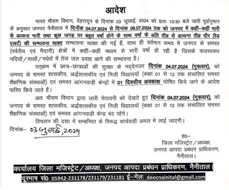 देहरादून: भारी बारिश का सिलसिला जारी है। मौसम विभाग की ओर से कई जिलों के लिए भारी बारिश का अलर्ट जारी किया गया है। नैनीताल और ऊधमसिंह नगर में स्कूलों की छुट्टी घोषित कर दी गई है।